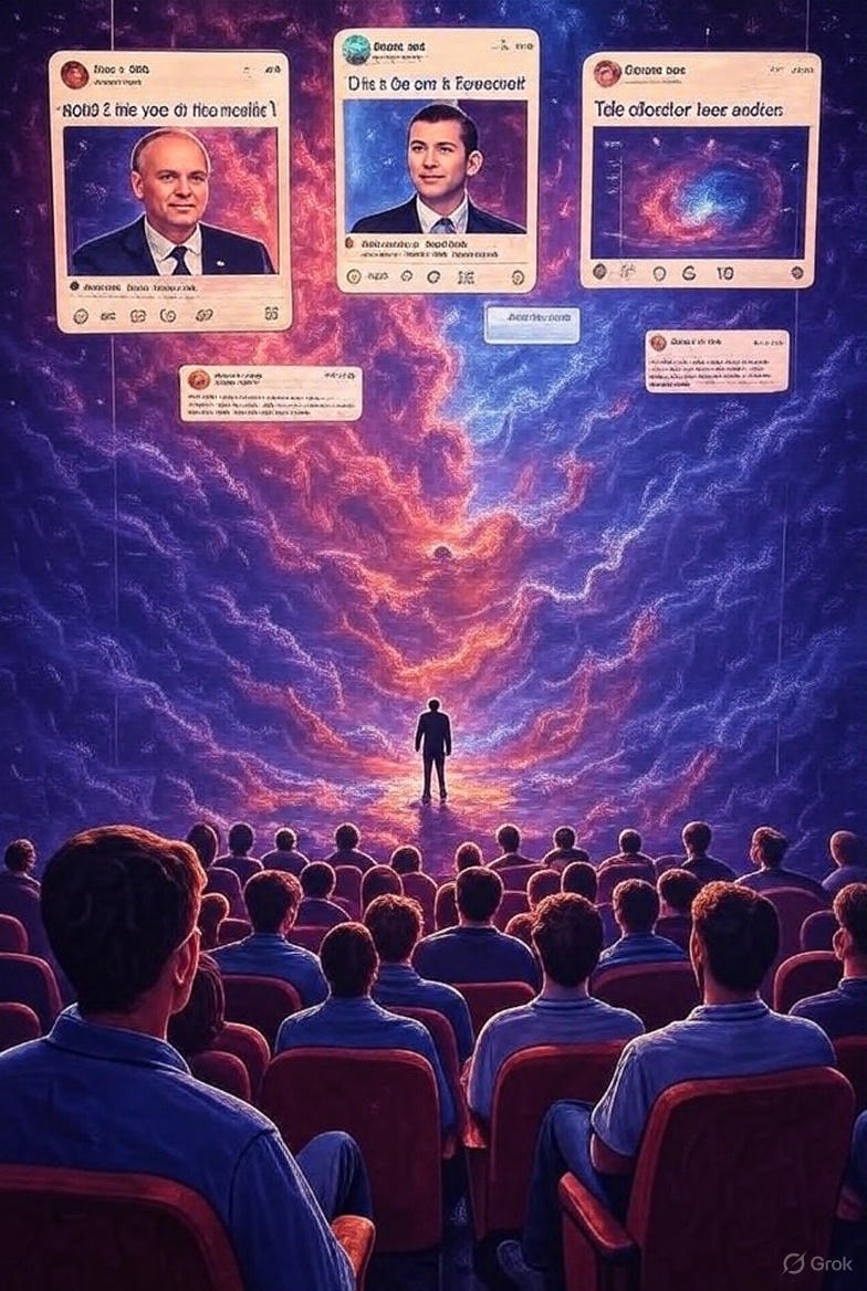 Picture yourself in a dimly lit theater, watching a Twilight Zone episode that never ends. The world feels familiar, but the edges are warped…colors too vivid, voices too shrill. Reality, the shared understanding we once relied on to make sense of life, now feels like a scripted illusion, orchestrated with cutting-edge special effects aka CGI. One minute, you’re laughing at AI-generated puppy videos; the next, you’re drowning in a flood of outrage, conspiracy theories, and existential dread. Even those puppies seem suspiciously perfect, designed to keep you hooked.